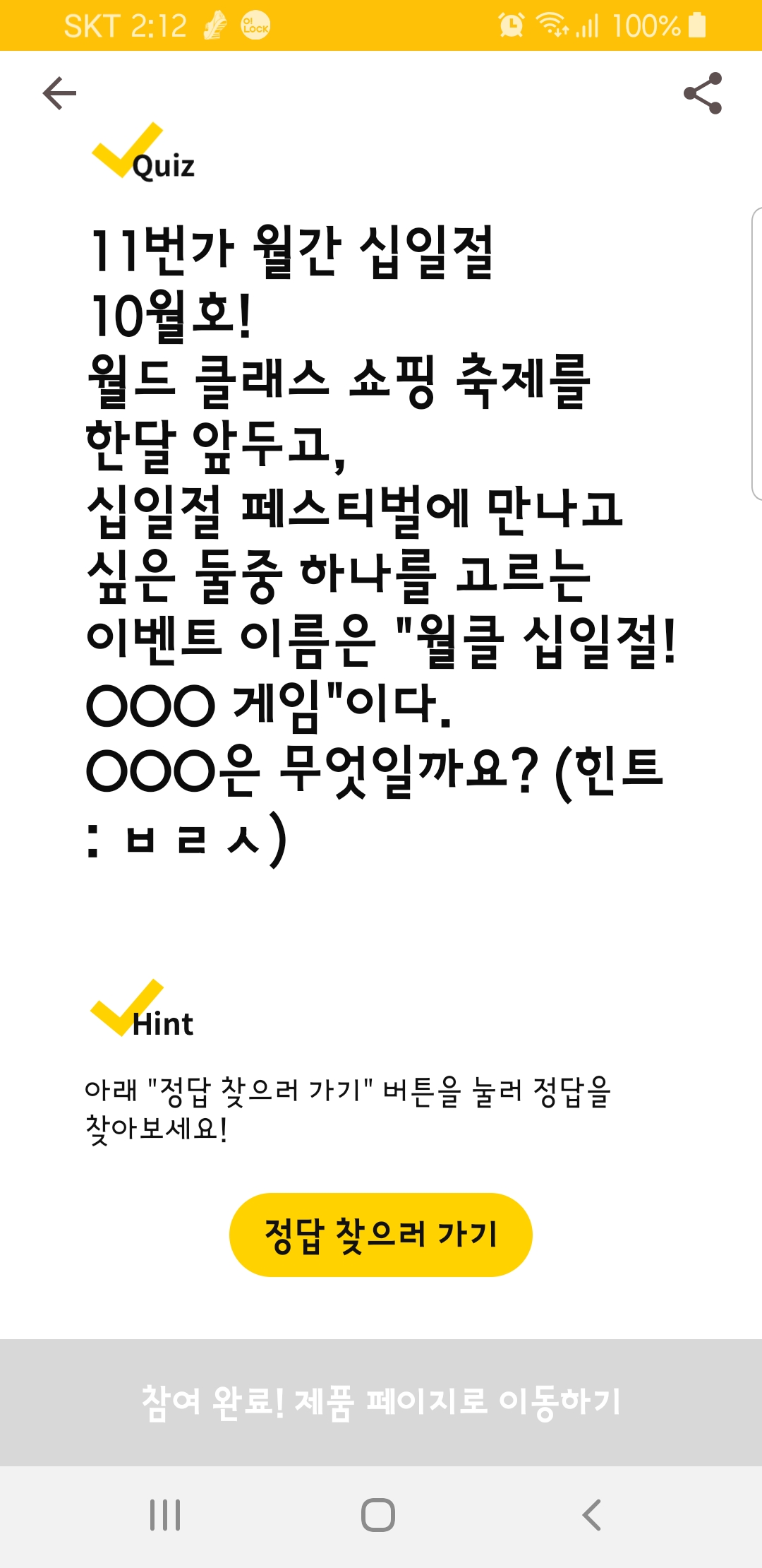 11번가 월간 십일절 10월호! 월드클래스 쇼핑축제를 한달앞두고, 십일절 페스티벌에 만나고 싶은 둘중하나를 고르는 이벤트이름은 "월클 십일절! OOO게임"이다. 000은 무엇일까요?