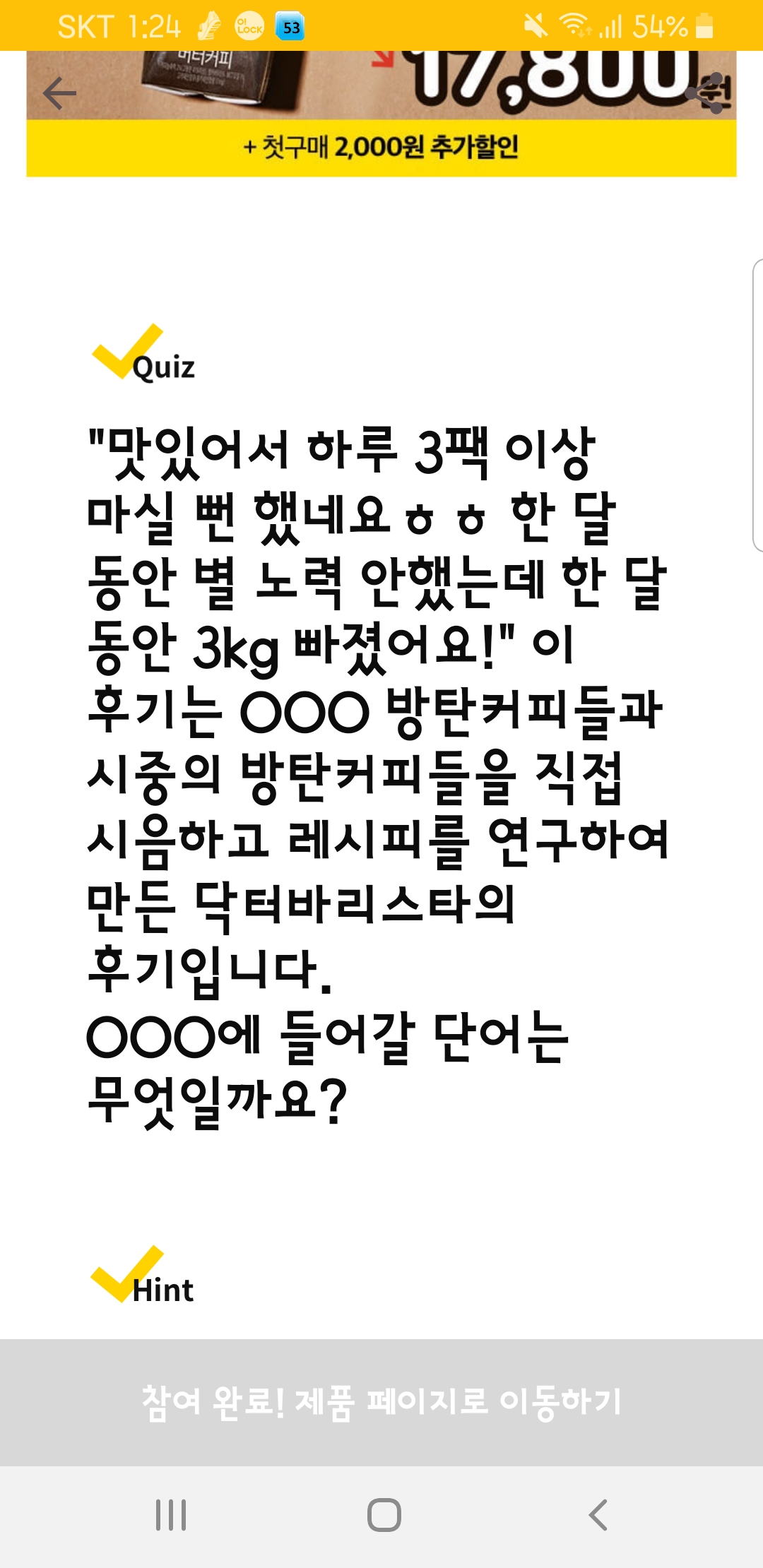 아침에 닥터바리스타 마시면 점심까지 배불러서 밥양이 줄어요ㅎㅎ 일주일 다 되어 가는데 2kg 빠졌습니다." 이 후기는 맛과 영양, 그리고 방탄커피 OO까지 모두 잡은 닥터바리스타의 후기입니다. OO에 들어갈 단어는 무엇일까요?