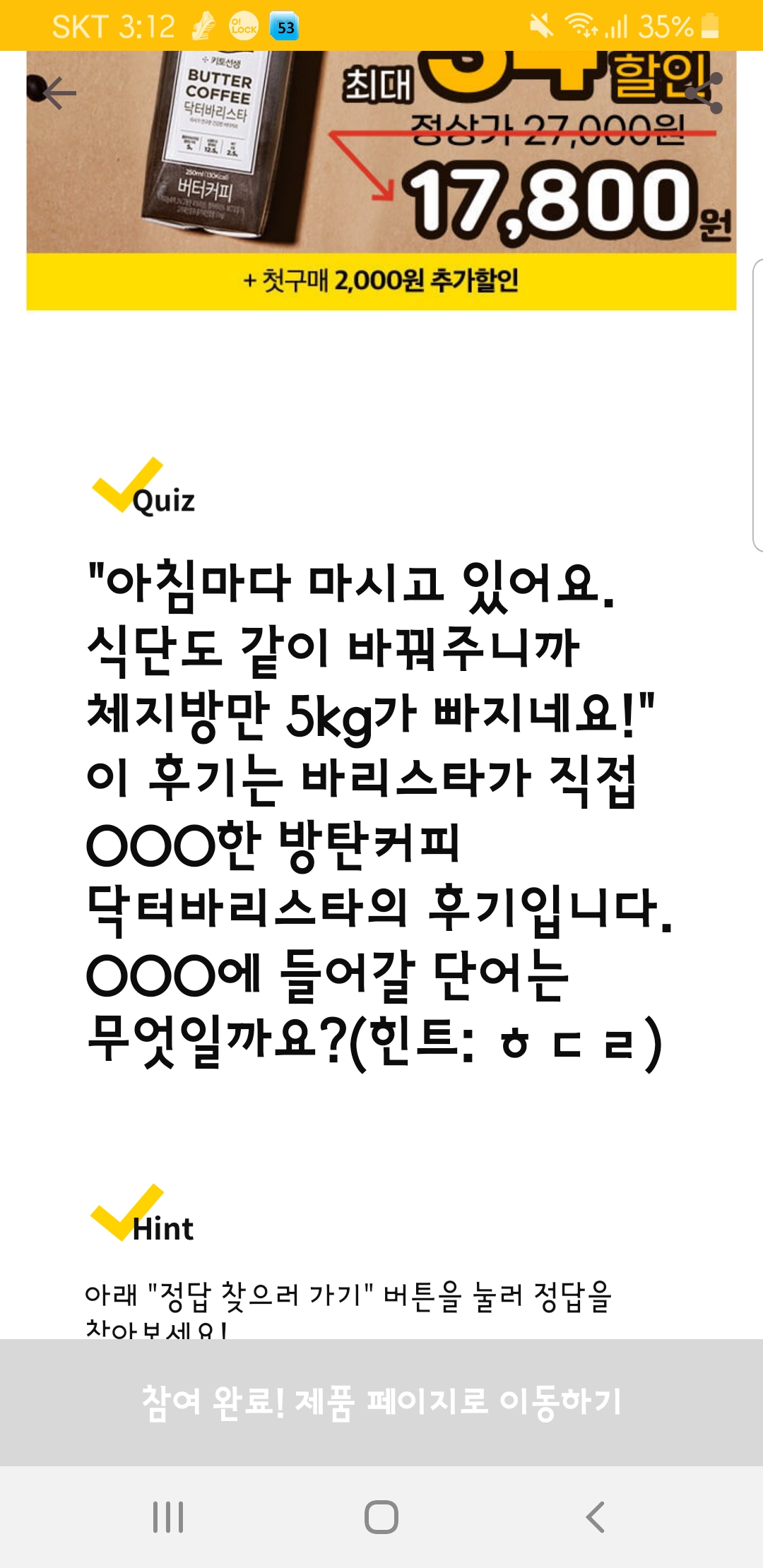 ''아침마다 마시고 있어요. 식단도 같이 바꿔주니까 체지방만 5kg가 빠지네요!'' 이 후기는 바리스타가 직접 OOO한 방탄커피 닥터바리스타의 후기입니다. 000에 들어갈 단어는 무엇일까요?